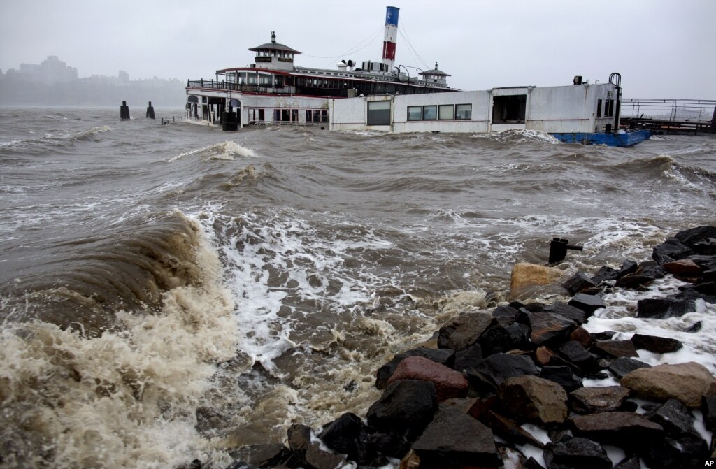 MMOJA WA ASKARI AKIANGALIA MAWIMBI YA MAJI YAKIPIGA PWANI YA MOJA ILIKUMBWA NA KIMBUNGA HICHO CHA SANDY.